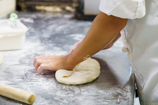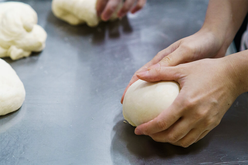 オーブンへ入る前のふっくらおいしそうに膨らんだ生地の発酵の状態を目と手でしっかりと見極めます。
